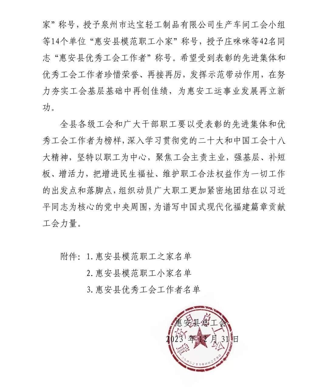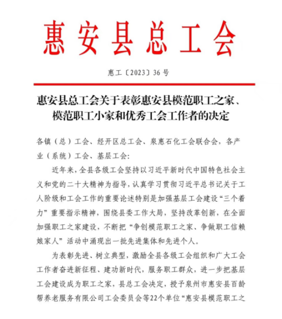 日前,惠安縣總工會下發(fā)了《關(guān)于表彰惠安縣模范職工之家、模范職工小家和優(yōu)秀工會工作者的決定》,我校工會被惠安縣總工會授予“惠安縣模范職工之家”稱號。