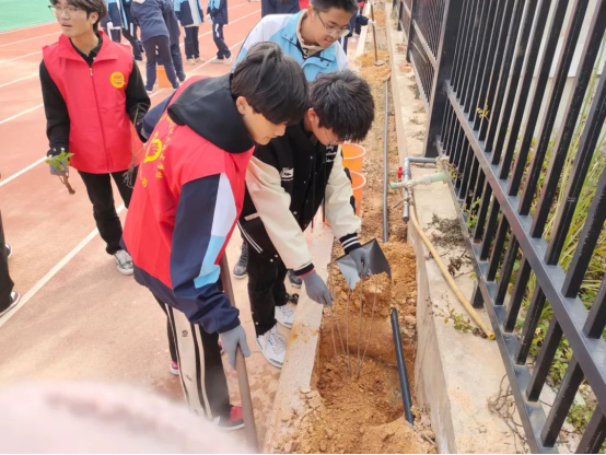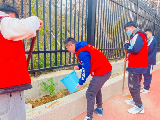 青年志愿,為綠充“植”。師生齊聚,相互協(xié)作,個個干勁十足,解袋、扶苗、填土、施肥、澆水,將一棵棵充滿生機和希望的小樹植入大地,校園呈現(xiàn)出一派熱火朝天的勞動景象。