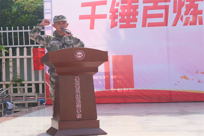軍訓(xùn)教官代表帶領(lǐng)全體人員進(jìn)行宣誓:服從命令,聽從指揮,尊重教官,刻苦訓(xùn)練,遵守紀(jì)律,磨煉意志,不怕困難,爭做訓(xùn)練標(biāo)兵,勇?lián)鷩乐厝?,為班?jí)爭光,為云揚(yáng)添彩!