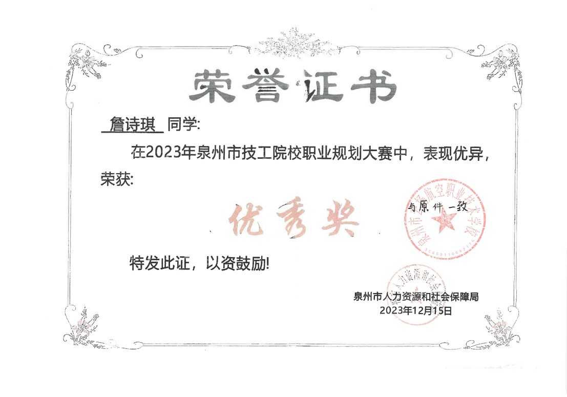 2023年泉州市技工院校職業(yè)規(guī)劃大賽“優(yōu)秀獎(jiǎng)”