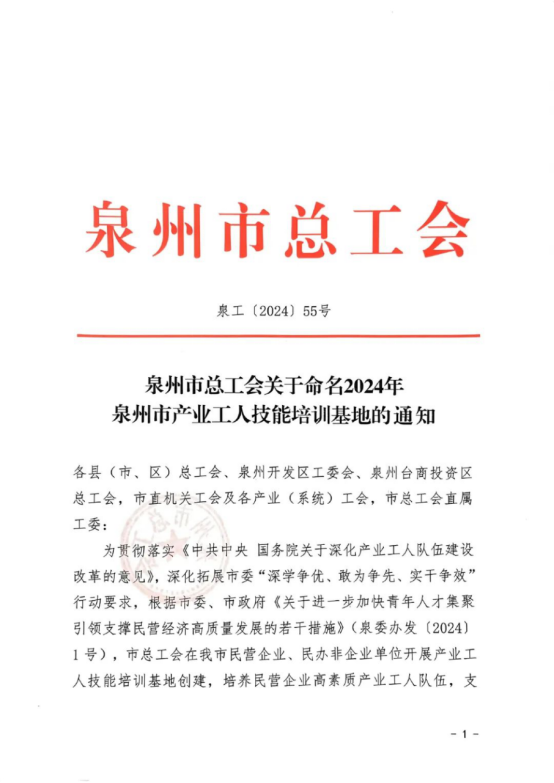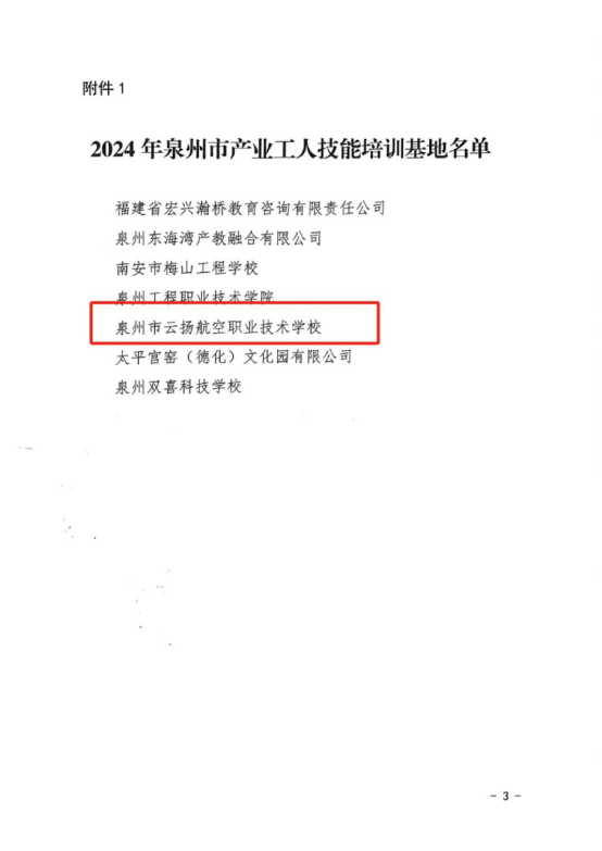 12月8日,泉州市總工會發(fā)文,泉州市云揚航空職業(yè)技術(shù)學(xué)校被泉州市總工會命名為2024年泉州市產(chǎn)業(yè)工人技能培訓(xùn)基地。