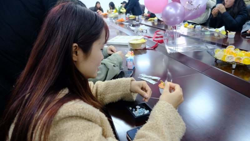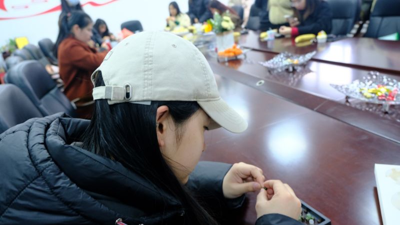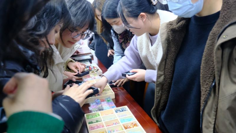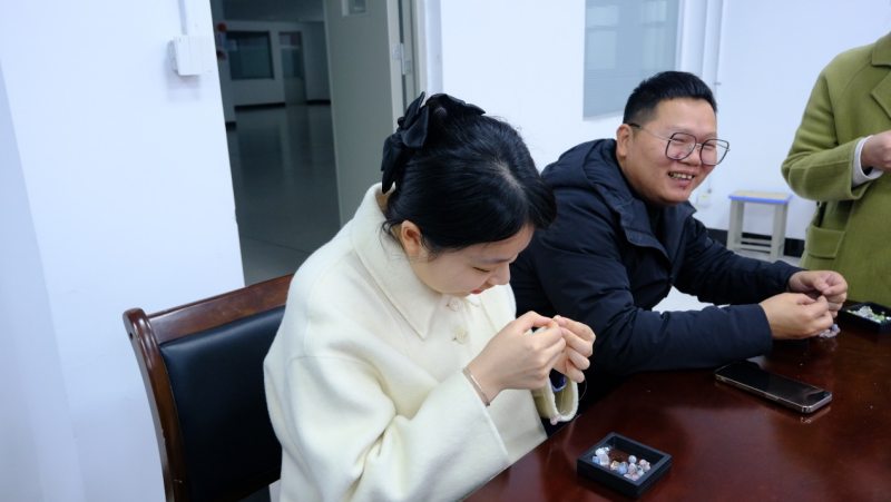 3月7日下午,學(xué)校大會議室溫馨而雅致,邀請共建單位民生銀行共聚一堂,共同開展導(dǎo)師以“珠串熠熠,遇見不一樣的她力量”為主題?,F(xiàn)場演示了香珠手串的制作技法。從色彩的巧妙搭配到編織技巧的靈活運(yùn)用,女職工們在縷縷清香中開啟了一段創(chuàng)意之旅。清脆的珠玉碰撞聲與歡快的笑聲交織在一起,構(gòu)成了一曲動人的樂章。女職工們充分發(fā)揮自己的創(chuàng)意與想象力,精心挑選珠子、搭配顏色、設(shè)計(jì)款式,現(xiàn)場氣氛熱烈非凡。經(jīng)過一個(gè)多小時(shí)的精心制作,一串串精美別致、獨(dú)一無二的手串作品陸續(xù)誕生。大家互相欣賞作品、交流心得,臉上洋溢著喜悅與自豪的笑容。