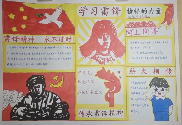 同學(xué)們匠心獨(dú)運(yùn),精心創(chuàng)作了一系列手抄報(bào),生動(dòng)展現(xiàn)了雷鋒同志的生平事跡、經(jīng)典名言警句以及參與學(xué)雷鋒活動(dòng)的精彩瞬間。這些手抄報(bào)內(nèi)容豐富多元,形式活潑多樣,不僅充分展示了同學(xué)們?cè)诶L畫(huà)與書(shū)寫(xiě)方面的才華,更深刻體現(xiàn)了大家對(duì)雷鋒精神的崇敬之情與積極傳承的堅(jiān)定決心。