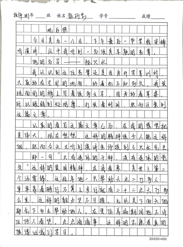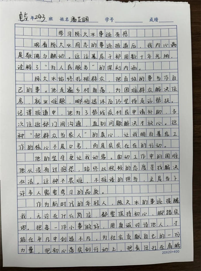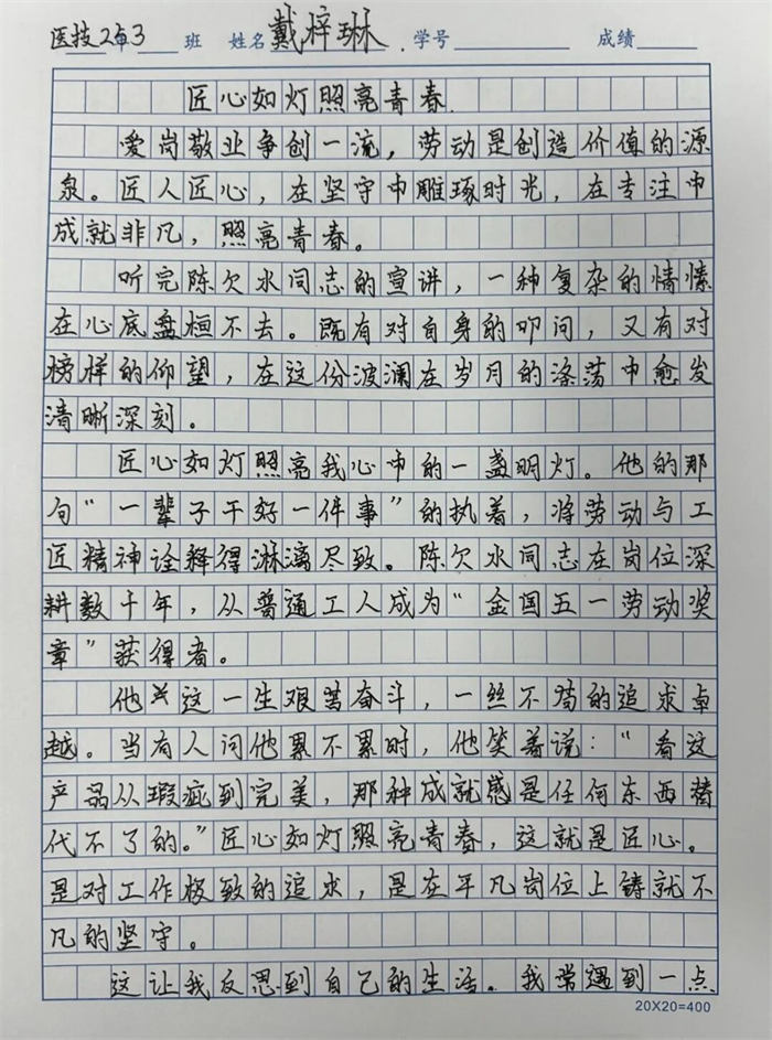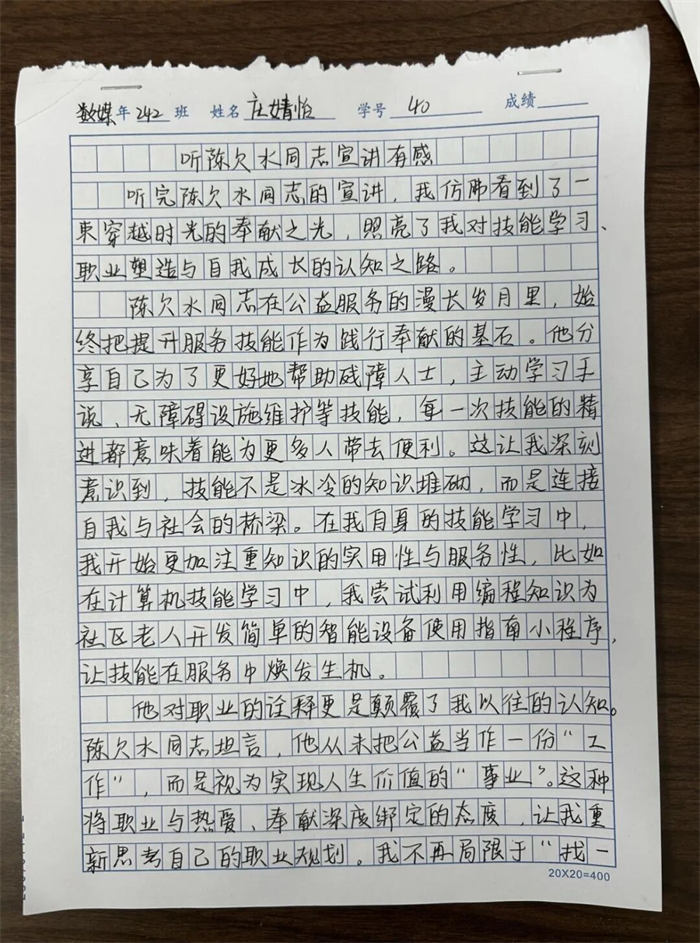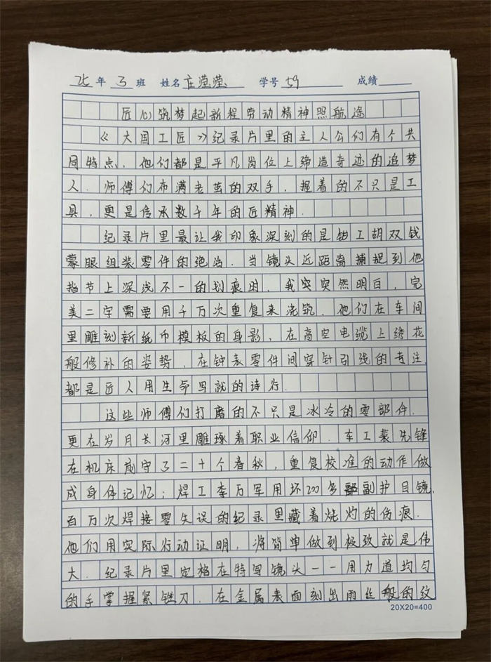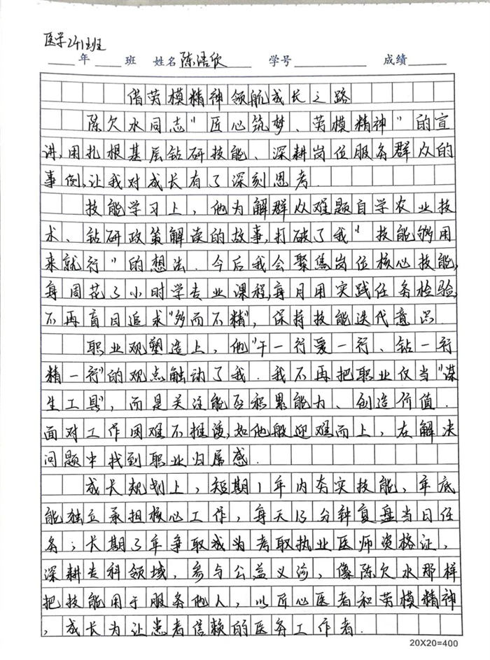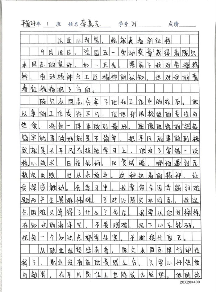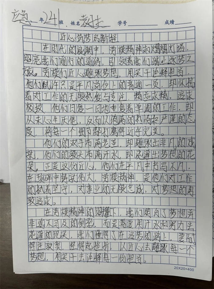 為深化學習成效,讓勞模精神真正融入育人全過程,學校同步啟動“勞模精神照我心”主題征文比賽,鼓勵學生結合聆聽感受與自身實際,暢談對勞動價值、青春擔當?shù)乃伎?。比賽得到各年級積極響應,共收到來稿30余篇,同學們用文字書寫敬意、抒發(fā)志向,紛紛表示要以陳欠水同志為榜樣,刻苦學習、服務社會,讓奮斗成為青春最亮麗的底色。
