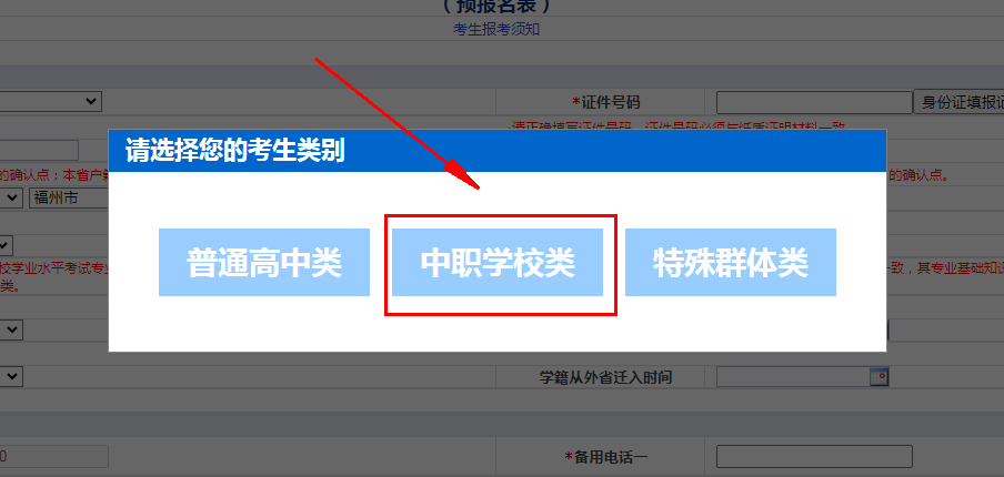 關(guān)閉考生報(bào)名須知頁面以后,選擇中職學(xué)校類進(jìn)行報(bào)名,千萬不能選錯(cuò)考生類別: