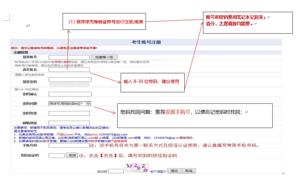 1.注冊的賬號、密碼一定要記?。。ㄒ院蟛榉帧⑻顖?bào)志愿都要用到)