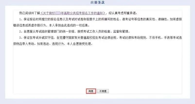 閱讀《考試組織作弊等行為已正式入刑》10秒后,點(diǎn)擊“我已閱讀”按鈕,圖見步驟一,跳轉(zhuǎn)到注冊條款頁面,閱讀通知文件,10秒后,點(diǎn)擊“同意”按鈕,跳轉(zhuǎn)到注冊頁面;若您點(diǎn)擊“不同意”按鈕,則跳轉(zhuǎn)到初始登錄界面,圖見步驟二。