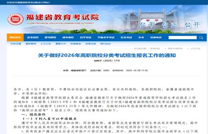 根據(jù)福建省教育廳關(guān)于做好2026年高職院校分類考試招生報(bào)名工作的通知閩教學(xué)〔2025〕17號要求,為幫助我校23級同學(xué)順利完成2026年高職院校分類考試招生報(bào)名工作,根據(jù)福建省教育考試院相關(guān)文件要求,學(xué)校結(jié)合實(shí)際情況編寫了2026年高職院校分類考試招生報(bào)名工作(網(wǎng)上報(bào)名、現(xiàn)場確認(rèn))相關(guān)通知和指南,請同學(xué)們認(rèn)真閱讀并按時(shí)完成相關(guān)的網(wǎng)上報(bào)名和現(xiàn)場確認(rèn)!