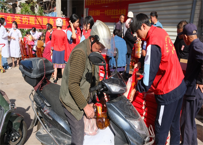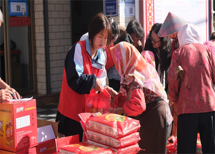 前郭村委會(huì)廣場(chǎng)上早已人聲鼎沸,舞蹈與煙花交織出濃濃的節(jié)日氣氛。人群中,我校志愿者們的身影格外醒目。他們俯身與老人交談,細(xì)心遞上物品,認(rèn)真傾聽(tīng)他們的家常,關(guān)切詢(xún)問(wèn)健康狀況與生活起居,將青年一代的敬意與關(guān)懷,化作一句句溫暖問(wèn)候,傳遞到每位老人心中。