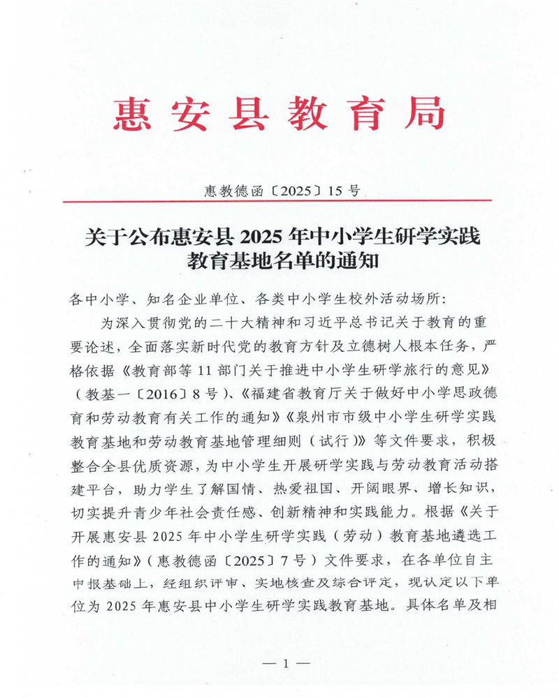 2025年9月30日,惠安縣教育局發(fā)布了《關(guān)于公布惠安縣2025年中小學(xué)生研學(xué)實(shí)踐教育基地名單的通知》,其中,我校云揚(yáng)航空科學(xué)館被認(rèn)定為“惠安縣中小學(xué)生研學(xué)實(shí)踐教育基地”。