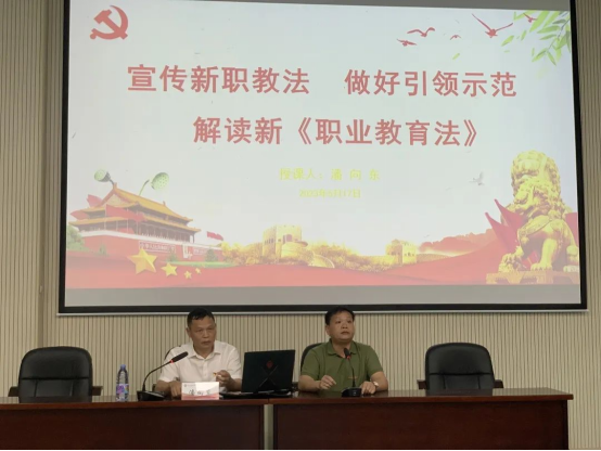 為做好新《職業(yè)教育法》的學(xué)習(xí)宣傳和貫徹實施,持續(xù)推進(jìn)我校依法執(zhí)教、依法辦學(xué),扎實推動職業(yè)教育高質(zhì)量發(fā)展,5月17日下午,學(xué)校黨支部潘向東書記作新《職業(yè)教育法》專題解讀講座,為全體師生上了一堂精彩的思政課程,講座由陳炳耀副校長主持。