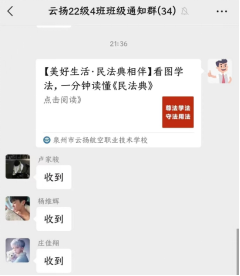 通過《民法典》知識在微信、QQ等各類網(wǎng)絡(luò)平臺的推送,我校向廣大師生及家長朋友們推送了《民法典》相關(guān)知識,重點就如何保護未成年人的權(quán)益做重點宣傳,進一步加大了《民法典》的宣傳和學(xué)習(xí)力度。