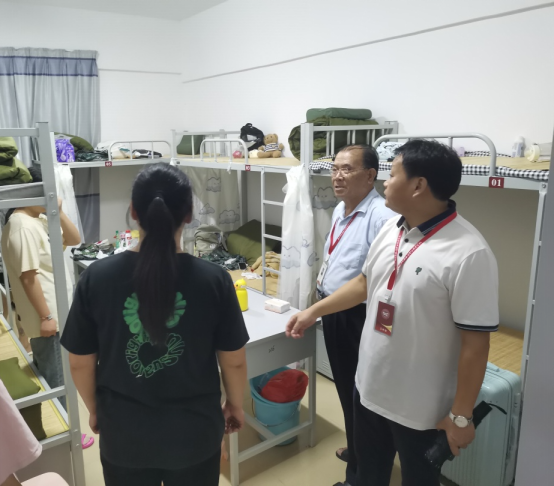 又是一年迎新季,為深入了解新生思想動(dòng)態(tài),幫助學(xué)生調(diào)整心態(tài)盡快融入新學(xué)校、新集體。9月4日晚,陳炳耀副校長(zhǎng)、許碧奎副校長(zhǎng)帶領(lǐng)招就處、全體新生班主任、教官深入宿舍,為我校2023級(jí)新生送去深切關(guān)懷,了解同學(xué)們生活、思想各方面的情況,引導(dǎo)新生盡快適應(yīng)寢室環(huán)境,向新生傳遞了溫暖的問(wèn)候與祝福。