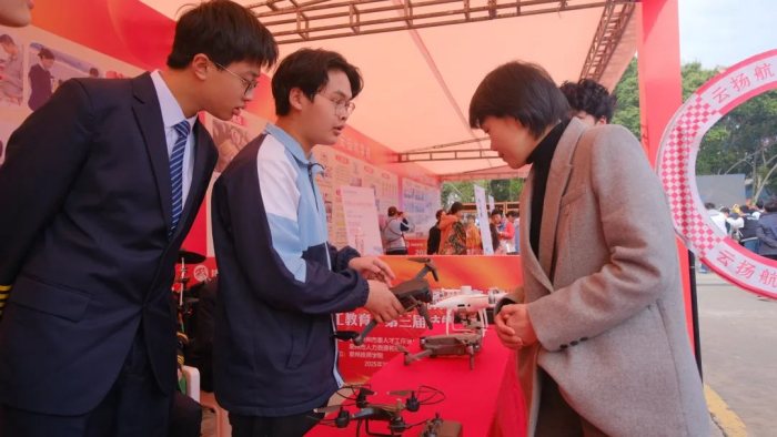 我校展區(qū)亮點紛呈,多款無人機整齊排列,吸引眾多觀眾駐足拍照留念。模擬飛行區(qū)更是人氣爆棚,師生化身科普講解員,詳細介紹無人機在農(nóng)業(yè)、救援等領(lǐng)域的應(yīng)用,現(xiàn)場精準(zhǔn)而流暢地講解如何操作無人機,不少青少年躍躍欲試,在老師的指導(dǎo)下首次體驗“飛手”的樂趣,直呼:“原來開無人機比打游戲還酷!”