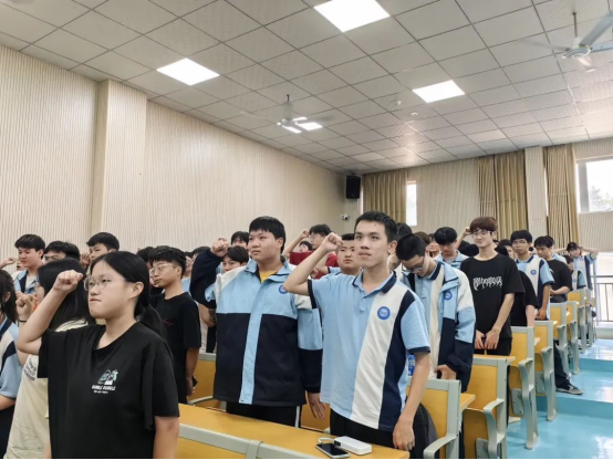 王俊杰同學(xué)為領(lǐng)誓人帶領(lǐng)全體同學(xué)宣誓,在莊嚴(yán)的宣誓中,22級的同學(xué)們表達了他們對學(xué)習(xí)的熱情和對未來的信心。誓言聲音洪亮,氣勢磅礴,如浪潮般涌動,彰顯青春的無畏和對勝利的渴望。充分展現(xiàn)了他們?nèi)σ愿埃瑳Q勝學(xué)考的決心和勇氣。