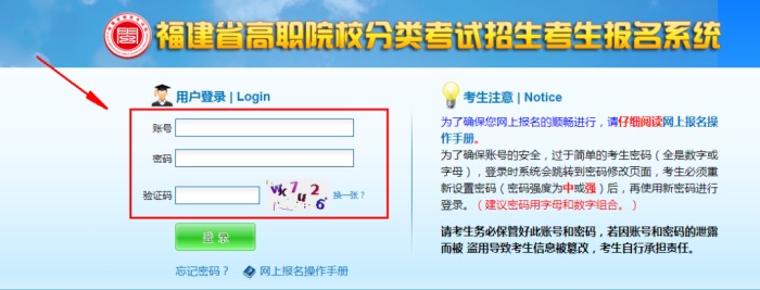 打開(kāi)福建省高職院校分類考試招生考生報(bào)名系統(tǒng),點(diǎn)擊界面上的注冊(cè)按鈕;用戶也可以點(diǎn)擊登錄界面上的《網(wǎng)上報(bào)名操作手冊(cè)》查看操作步驟細(xì)節(jié),如下圖: