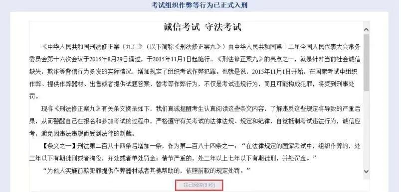 閱讀《考試組織作弊等行為已正式入刑》10秒后,點(diǎn)擊“我已閱讀”按鈕,圖見(jiàn)步驟一,跳轉(zhuǎn)到注冊(cè)條款頁(yè)面,閱讀通知文件,10秒后,點(diǎn)擊“同意”按鈕,跳轉(zhuǎn)到注冊(cè)頁(yè)面;若您點(diǎn)擊“不同意”按鈕,則跳轉(zhuǎn)到初始登錄界面,圖見(jiàn)步驟二。