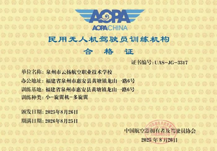 8月26日,我校成功取得由中國(guó)航空器擁有者及駕駛員協(xié)會(huì)(AOPA)頒發(fā)的“民用無(wú)人機(jī)駕駛員訓(xùn)練機(jī)構(gòu)合格證”,正式成為中國(guó)民航局(CAAC)認(rèn)證的民用無(wú)人機(jī)駕駛員訓(xùn)練機(jī)構(gòu)。