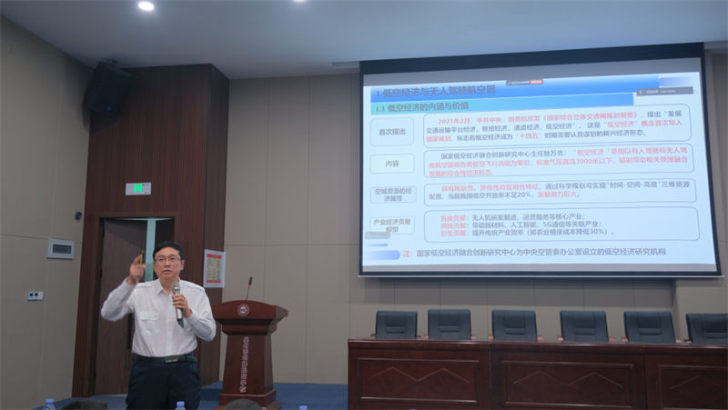 在師生熱烈的掌聲中,遲巖院長(zhǎng)開(kāi)始了主題講座。他結(jié)合云揚(yáng)集團(tuán)在航空領(lǐng)域的實(shí)踐積淀,從政策演進(jìn)、技術(shù)突破與場(chǎng)景應(yīng)用三大維度展開(kāi)分享。在低空無(wú)人機(jī)發(fā)展板塊,他深入解讀了國(guó)家低空空域開(kāi)放試點(diǎn)政策帶來(lái)的行業(yè)機(jī)遇,強(qiáng)調(diào)航空制造技術(shù)升級(jí)對(duì)無(wú)人機(jī)性能提升的核心支撐作用。